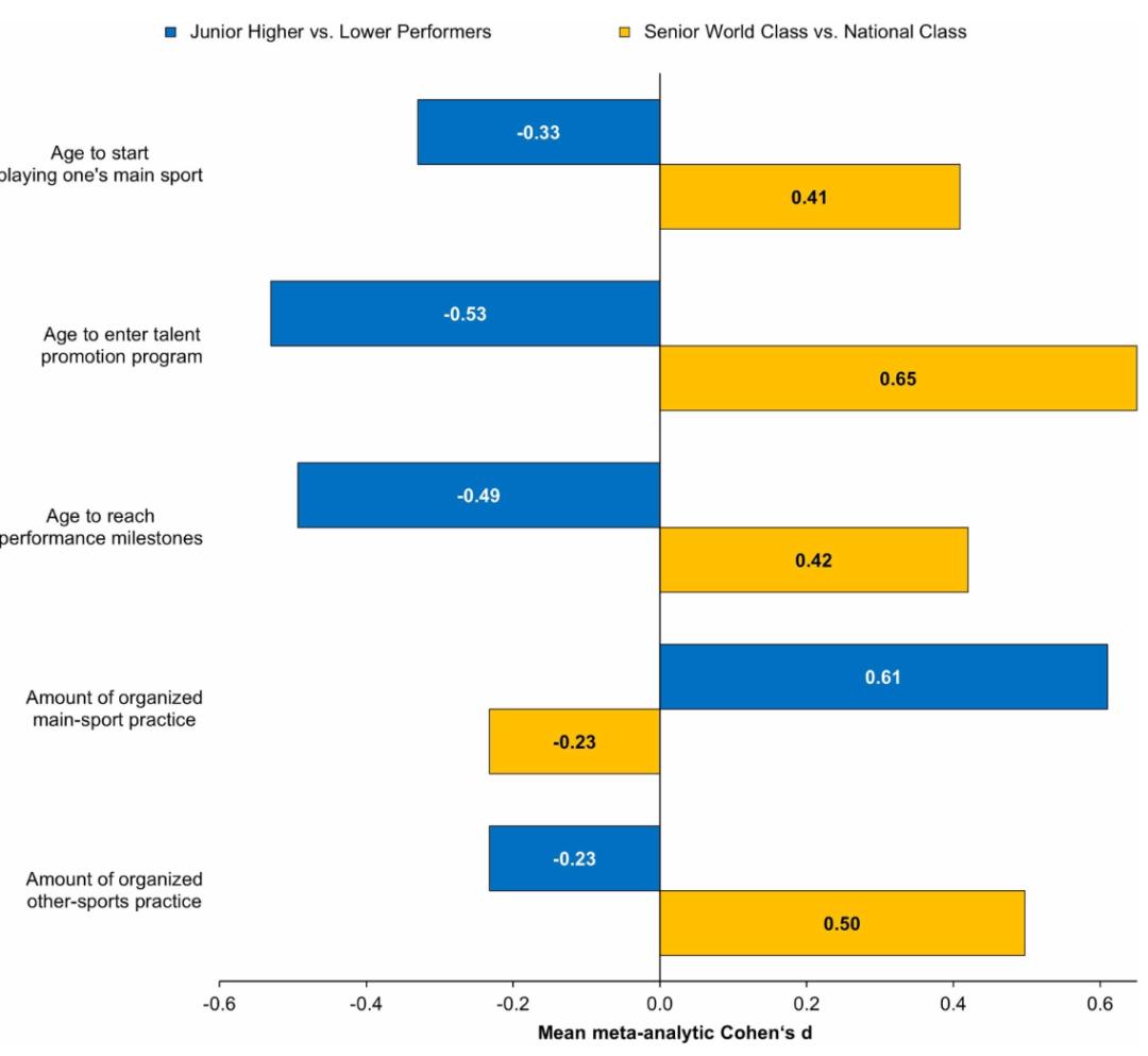 对于青少年优秀者他们的共同特征是:更早开始专项训练、更早进入精英人才培养项目、更早达到各类“里程碑”(如首次参加全国或国际比赛)、在主项上投入更多练习时间、而在其他领域的练习时间更少。