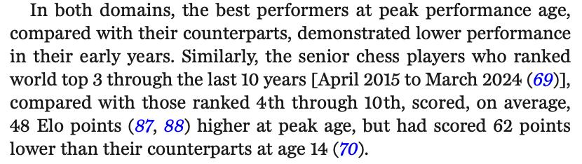 国际象棋的数据同样印证了这一点。过去十年(2015年4月至2024年3月)世界排名前三的棋手,在巅峰期平均比排名第四到第十的棋手Elo分高出48个。但追溯到14岁时,这些后来登顶前三的棋手反而比第四到第十名的棋手Elo分低62。