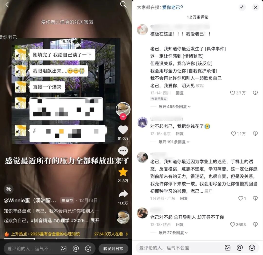 网友@Winnie蛋 结合心理学内容,把爱你老己做成了一个万能代入模版,并邀请朋友测试,朋友填完之后自己给自己读到“直接一个爆哭”,感觉最近所有的压力全都释放出来了。