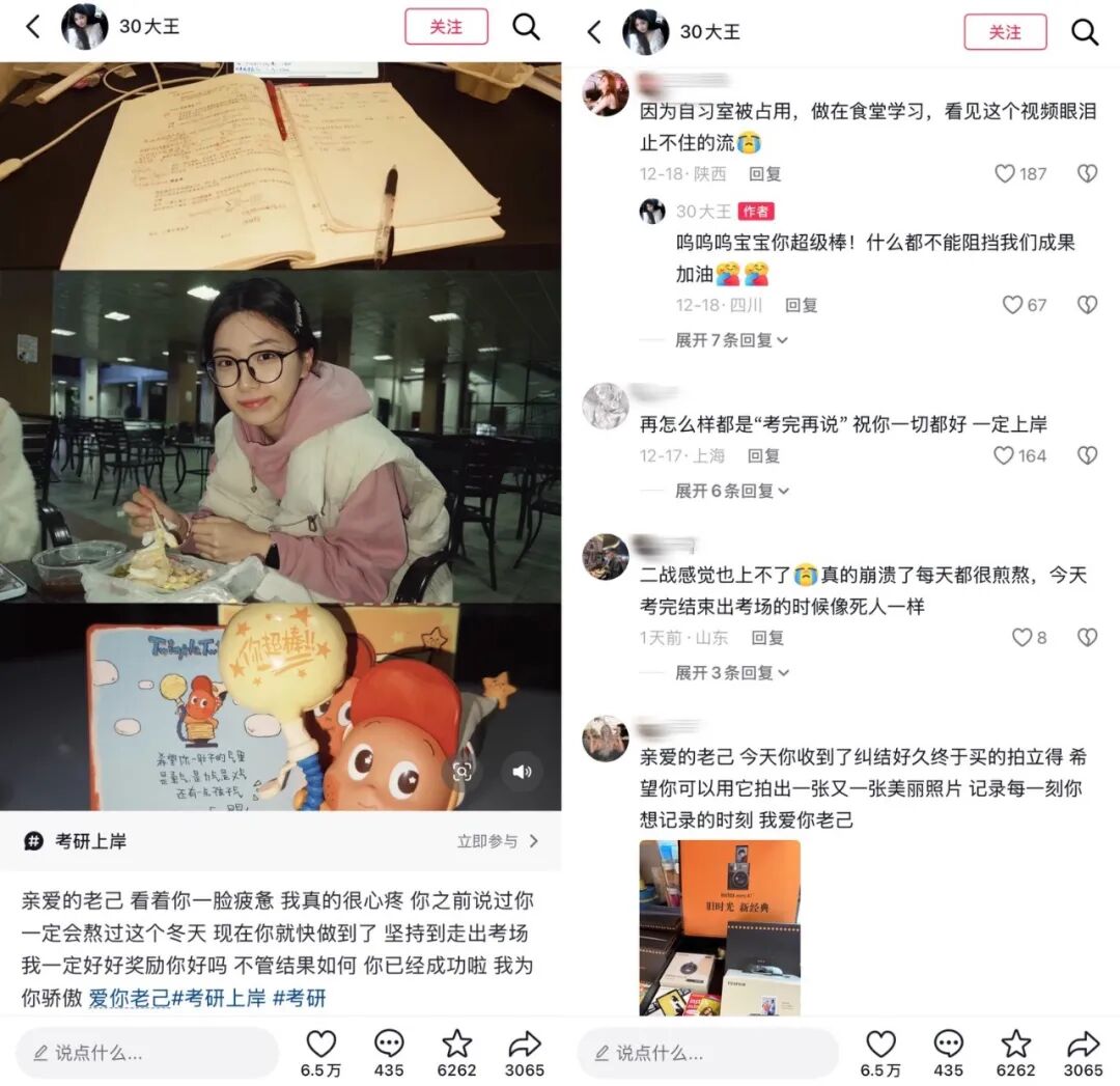 在网友@30大王 的视频里,她一边在昏暗的灯光下吃饭,一边发出考研资料,写道“你之前说过你一定会熬过这个冬天,现在你就快做到了,坚持到走出考场”,评论区几百条“祝你一切都好”“加油,坚持”。