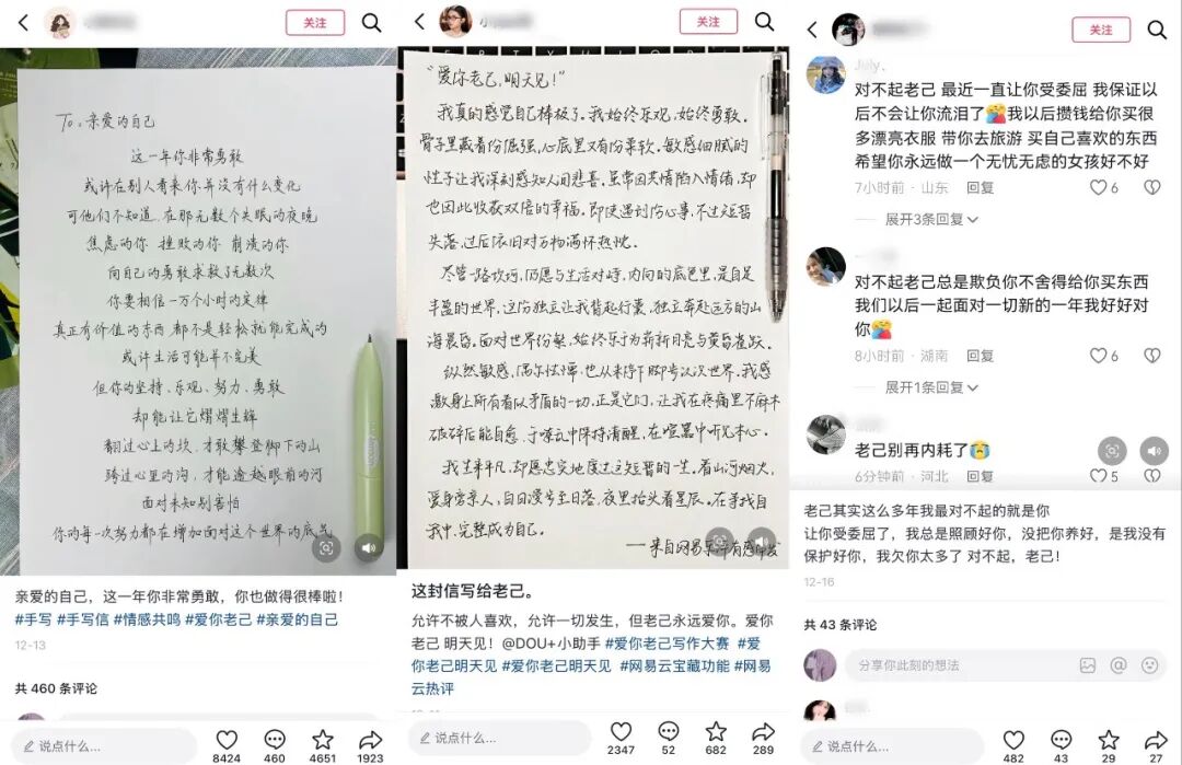各平台网友们集体上演“爱你老己”,话题评论区里,清一色都是“我也要给老己道歉”“老己辛苦了”这样的留言。并且内容形式多元化,拍短视频的、展示手写信的、独白视频等创作源源不断。