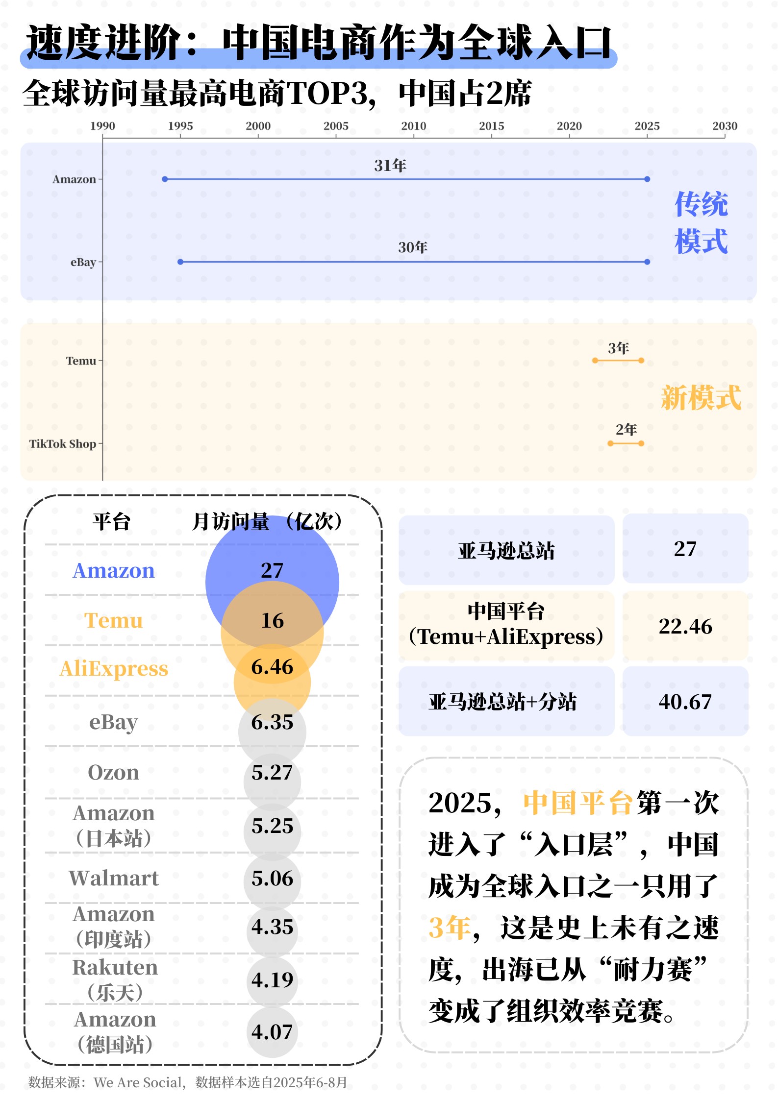 亚马逊用三十多年完成全球化布局,而Temu、AliExpress等中国平台,用2–3年进入全球访问量前列。差异不只在补贴,而在于供应链密度、组织效率和履约体系的整体压缩能力。