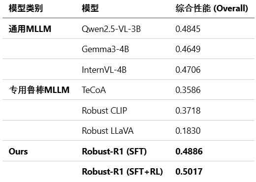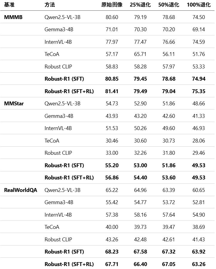 在三大基准上的抗降解性能对比,Robust-R1在各项指标上领先
