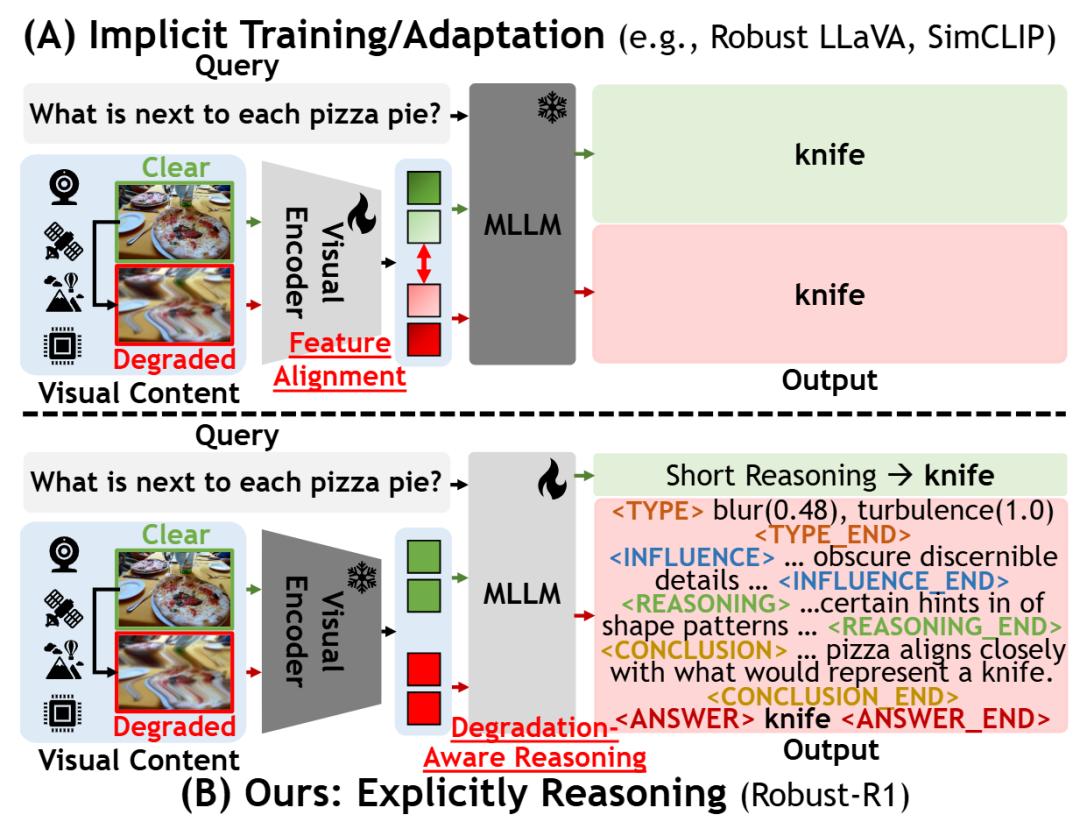 Robust-R1与现有方法的对比。现有方法(A)仅通过隐式训练增强视觉编码器;Robust-R1(B)通过显式推理链实现退化感知。