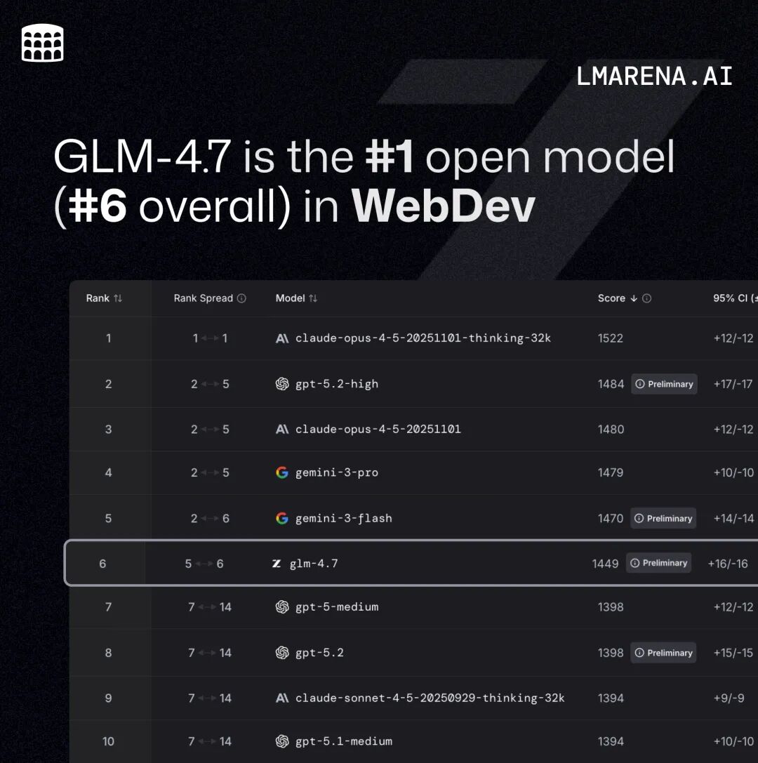 GLM-4.7在这里出道即巅峰,直接空降开源模型第一名!