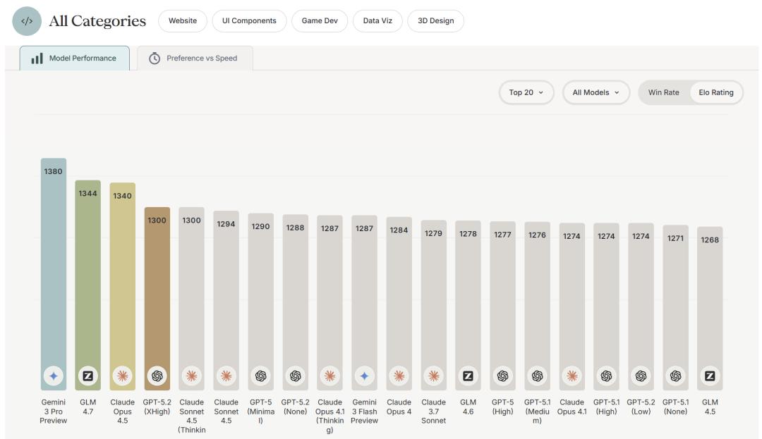 由开发者盲测投票得出的胜率(Win Rate)和Elo评分中,GLM-4.7高居第二,紧紧咬住了谷歌的Gemini 3 Pro Preview,甚至超过了Claude Opus 4.5和GPT-5.2。