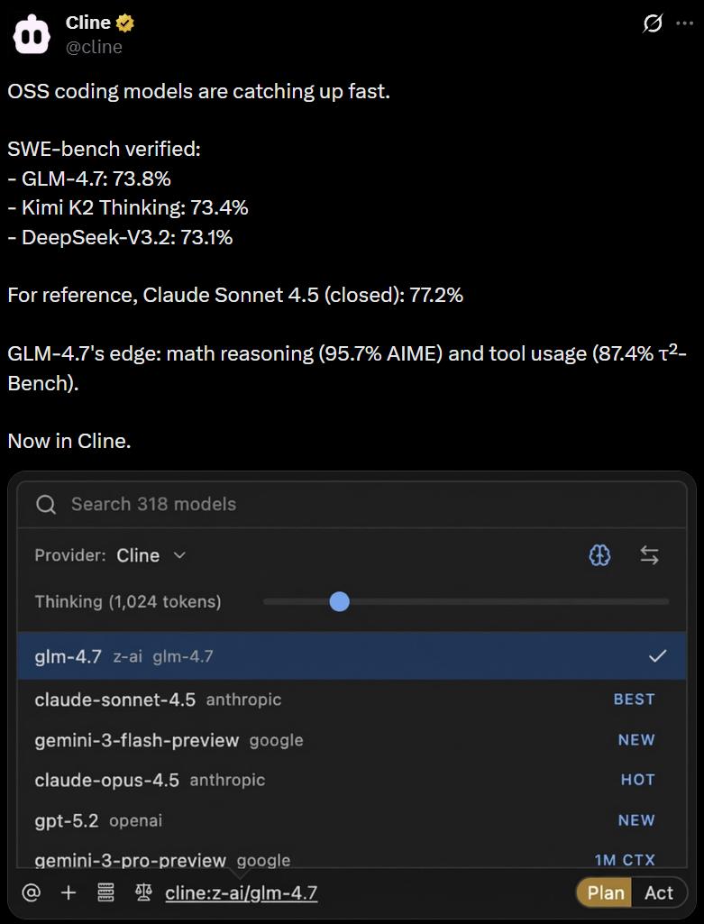 备受海外用户欢迎的Cline、Kilo、Vercel等一众主流AI平台,纷纷在第一时间官宣接入,并对其取得的巨大进步高度评价。