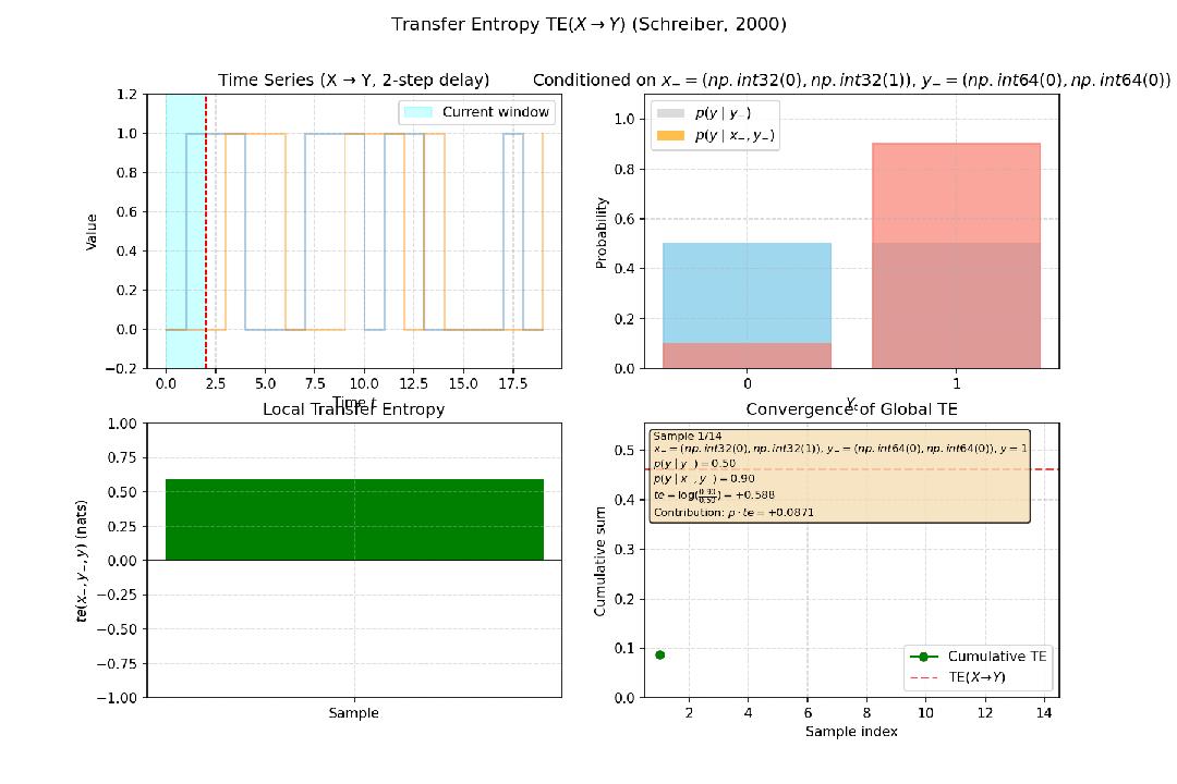 传递熵由Thomas Schreiber提出,是互信息在时间序列上的推广。它衡量是,在已知Y自身过去历史的情况下,X的过去历史能为预测Y的当前状态提供多少额外信息,即定向信息流。例如,在神经科学中,传递熵可用于判断是脑区A的活动影响了脑区B,还是反之,从而推断出因果关系的方向,这强于格兰杰因果只是进行非方向的因果量化。
