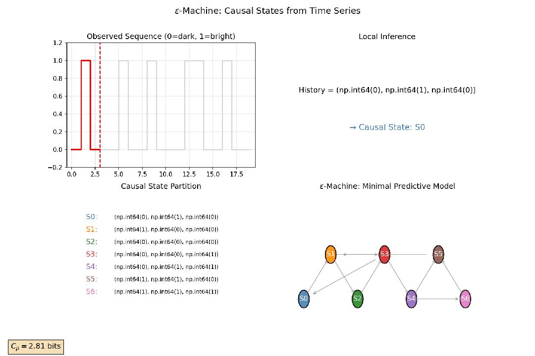 图7:因果态示意图:生成一段二元时间序列;用滑动窗口划分历史,对每个历史计算其未来条件分布 ;将具有相同未来分布的历史归为同一因果态节点;绘制 ϵ-机器:因果态为节点,转移概率为边,突出其为最小最优预测器