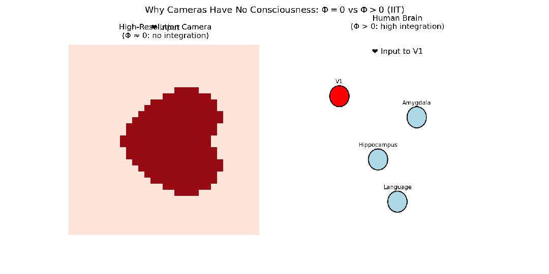 整合信息论由神经科学家Giulio Tononi提出,试图度量意识。其核心思想是,一个系统是否具有“意识”程度取决于其各个部分整合信息的程度,如整个系统所产生的信息大于其各部分信息之和的程度,该系统具备意识。考虑一个由百万个光电管组成的都高分辨率数码相机。每个像素都能高保真地记录光信息,整个传感器接收的信息量巨大 (高互信息) 。但是,如果你将传感器切割成两半,每一半仍然能很好地工作。传感器各部分之间几乎没有因果相互作用 (一个像素的状态不影响相邻像素) 。因此,这个系统的整合信息Φ非常低,故而照相机不可能有意识体验。
