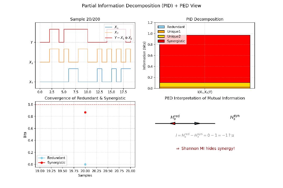 PED (Partial Entropy Decomposition) 是 PID 的自然推广,不同于 PID 对互信息 I(X1,…,XN;Y) 的分解 (需指定“sources”与“target”) ,PED 直接分解联合熵H(X1,…,XN),无需区分输入与输出