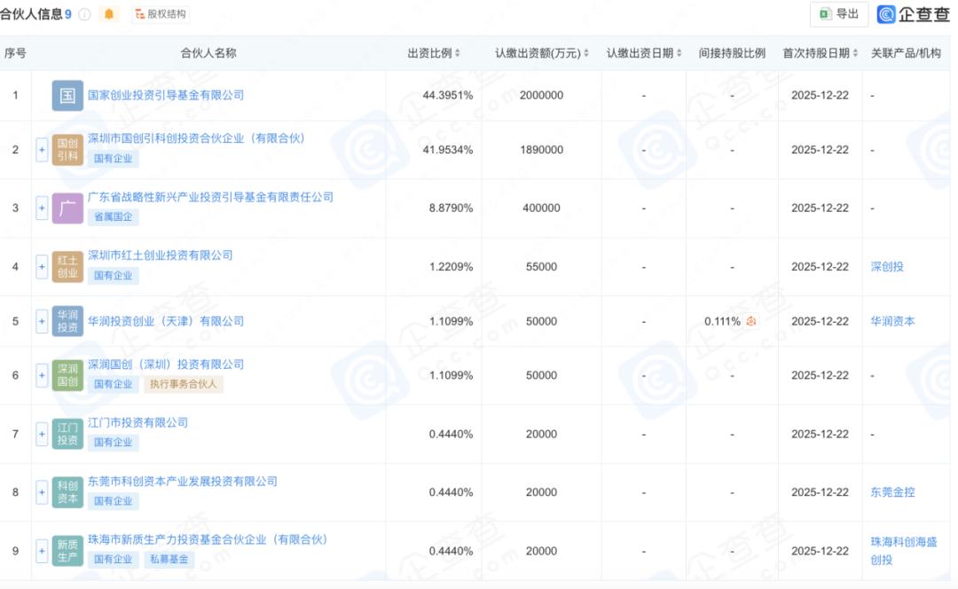 三、注册规模450.5亿元,粤港澳大湾区创业投资引导基金合伙企业(有限合伙),简称:粤港澳大湾区创投引导基金,注册地为深圳市南山区,基金执行事务合伙人为深润国创(深圳)投资有限公司——该主体由深创投系持股90%,华润系持股10%。