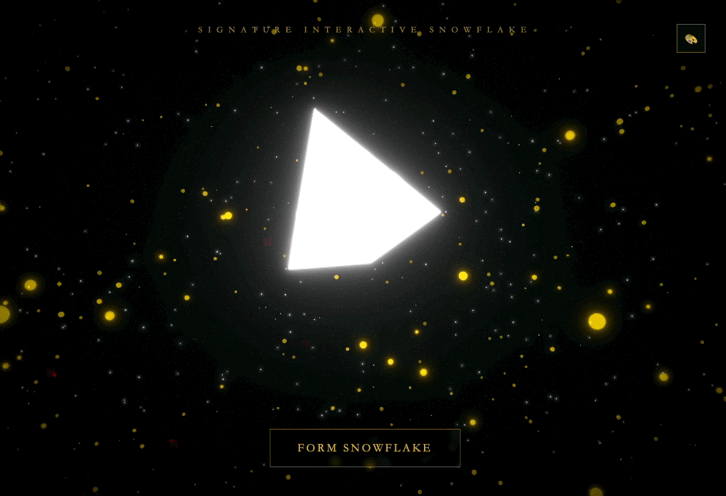 你是一位精通 React 19、TypeScript 和 Three.js (R3F) 的 3D 创意开发专家。 任务目标: 构建一个名为“圣诞雪花”的高保真 3D Web 应用。视觉风格主色调为高光金色,装饰绿色的松针,并伴有电影级的辉光效果。 技术栈: React 19, TypeScript, React Three Fiber, Drei, Postprocessing, Tailwind CSS