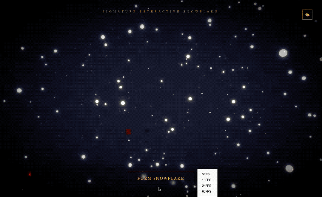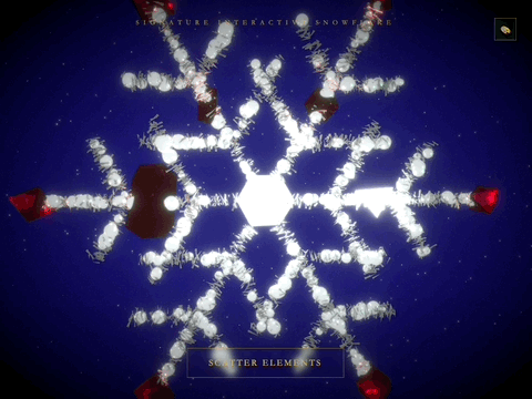 雪花结晶体的结构可以更清晰的展示出节点,这样就可以放置不同的年度总结板块。点击时,散落在夜空中的粒子和红宝石,共同组成了一朵雪花——就像一个个重要的事件、习惯、统计数字,构成了这一整年。