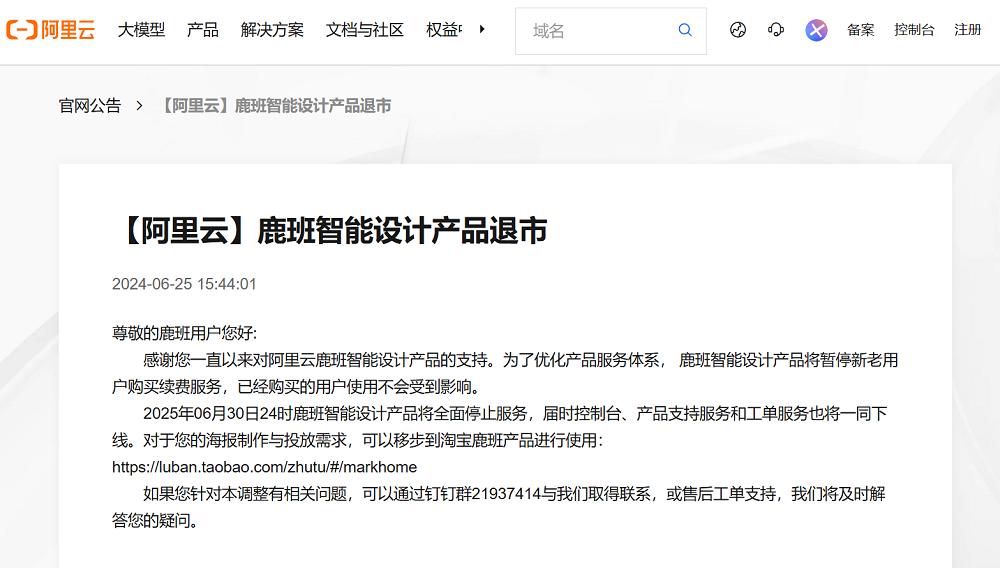 2024年,阿里云宣布鹿班智能设计产品暂停新老用户购买续费服务,并于2025年6月30号全面停止服务。今年5月,美图与阿里签署2.5亿美元可转债协议,双方将合作开发各类模型,围绕AI电商展开合作,阿里将在旗下的电商平台优先推广美图AI电商工具,而这正是鹿班此前的主要应用场景之一。