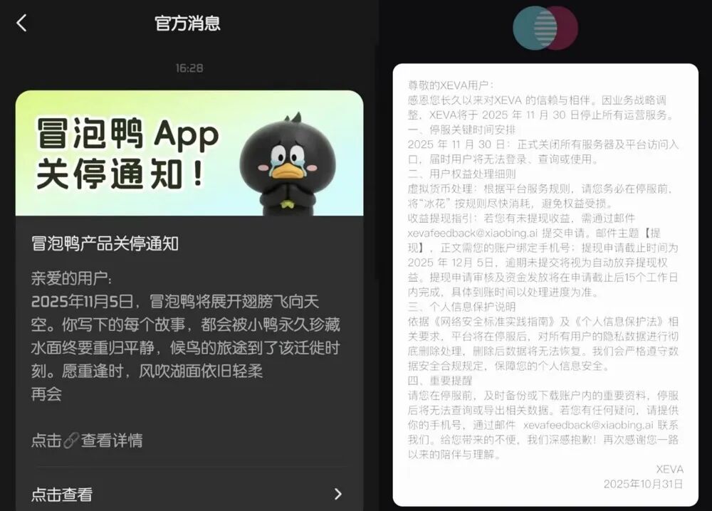 ▲冒泡鸭(左)与XEVA(右)的关停通知