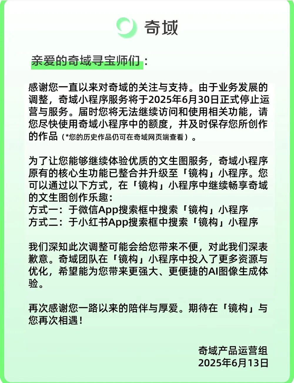 2023年底,小红书关停了Trik AI并推出奇域AI,后者同样主打国风。今年6月30日奇域AI因小红书业务调整关停,相关服务整合到小红书的镜构小程序中。