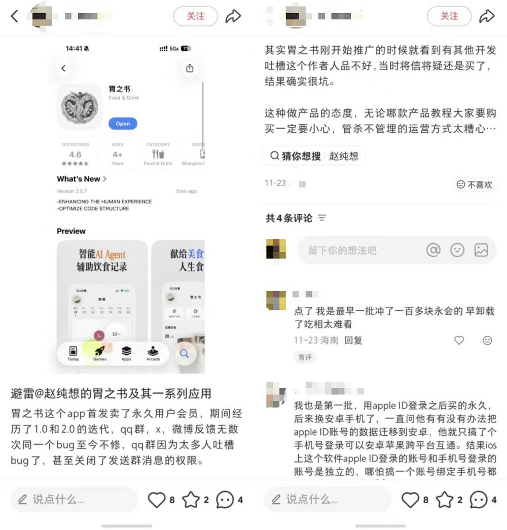 胃之书的终身会员价格为198元/年,定价并不低。不过,这款产品已经5个月没有更新,有小红书用户反馈官方沟通群里的反馈机制已经失效,QQ群甚至直接被禁言。