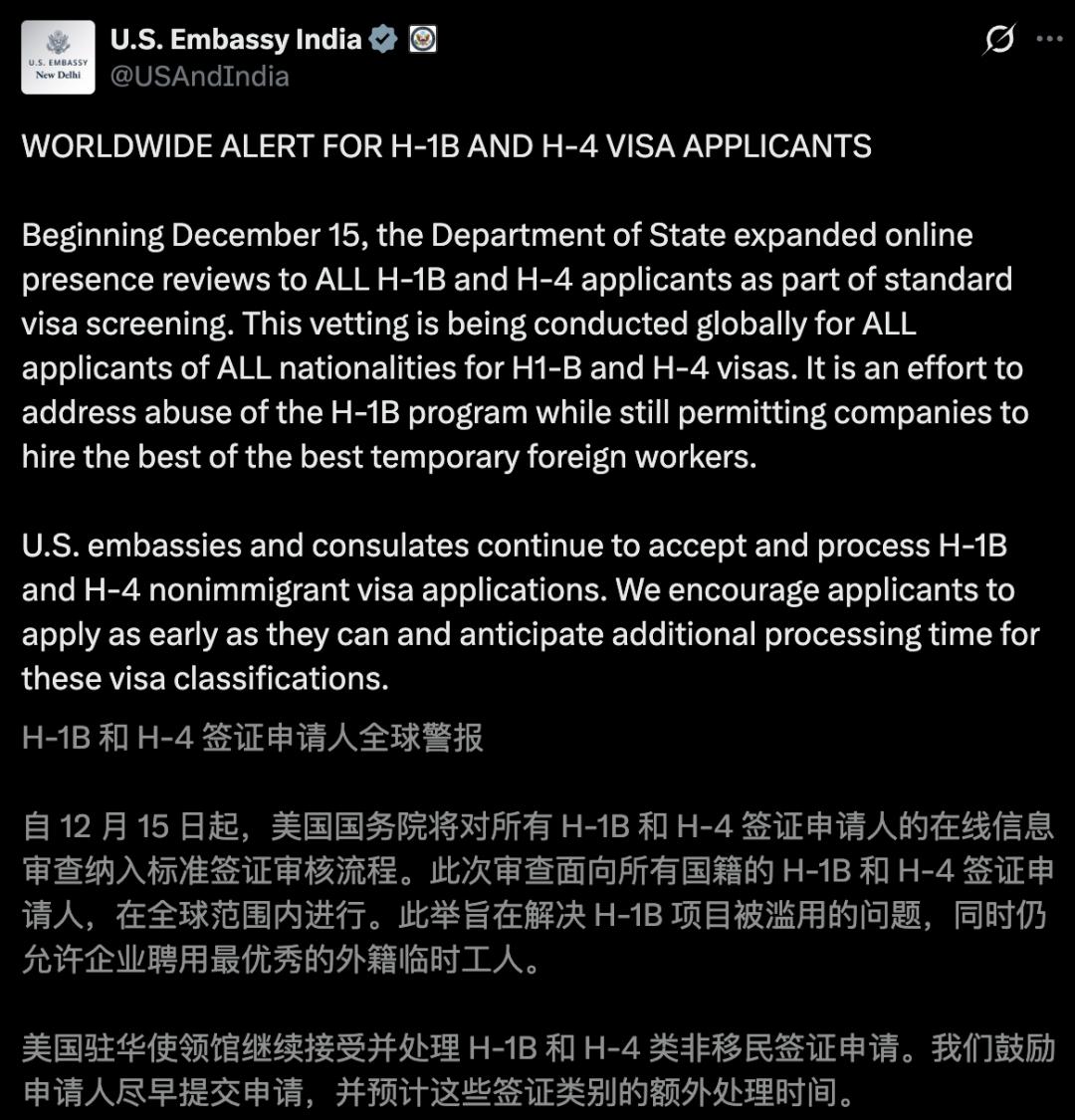 12月15日,美政府对H-1B签证持有人实施强制「社交媒体审查」(online presence review)。
