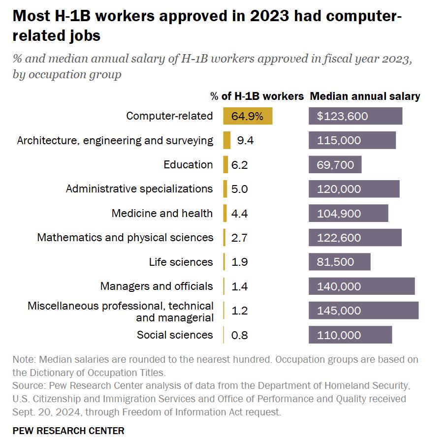 此前,皮尤研究中心数据显示,自2012年以来,获批的H-1B签证中,至少有60%是针对计算机相关工作的。