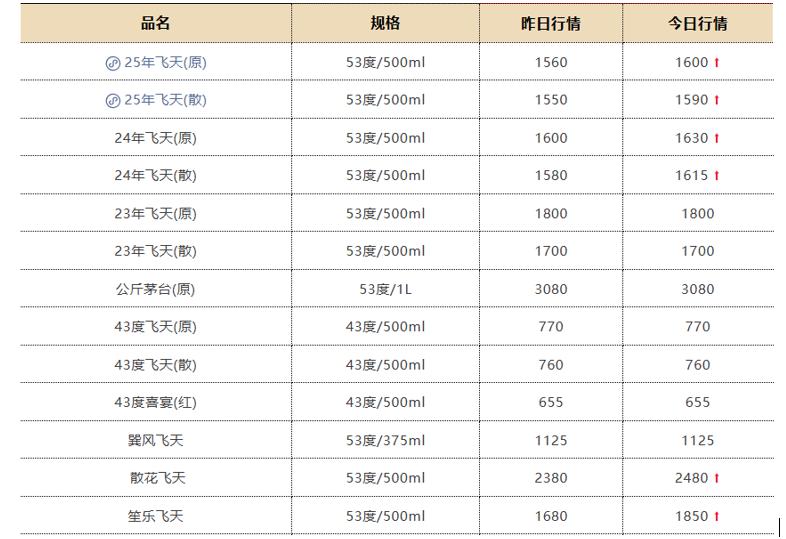 “今日酒价”披露的最新批发参考价显示,12月24日,25年飞天茅台原箱报1600元/瓶,较上一日涨40元;25年飞天茅台散瓶报1590元/瓶,较上一日涨40元。24年飞天茅台原箱报1630元/瓶,较上一日涨30元;24年飞天茅台散瓶报1615元/瓶,较上一日涨35元。
