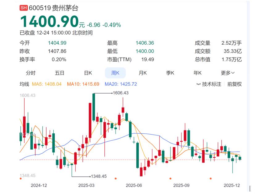 茅台股价今日(12月24日)收盘于1400.90元,略有回落。