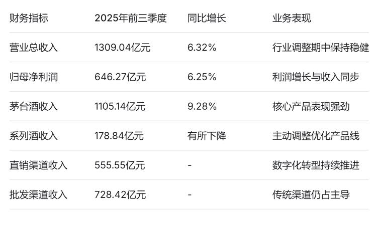 在行业整体承压的背景下,茅台2025年前三季度依然保持了稳健增长。公司实现营业总收入1309.04亿元,同比增长6.32%。