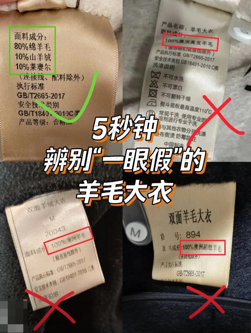 核心逻辑是,看水洗标的面料成分写法是否符合国标,不符合国标就是假羊毛,符合国标就是真羊毛。