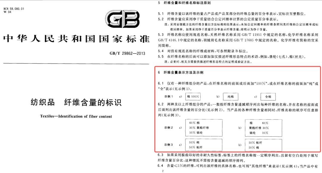 根据国标,面料成分或者说纤维成分的固定格式为:占比百分比 + 纤维名称。