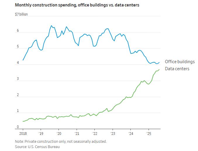 然而,如今AI正彻底改变这一格局。根据美国人口普查局的数据,数据中心建设支出最早在明年就可能超过写字楼。仲量联行预测,2025至2030年间,北美或将迎来价值约1万亿美元的新数据中心建设热潮。