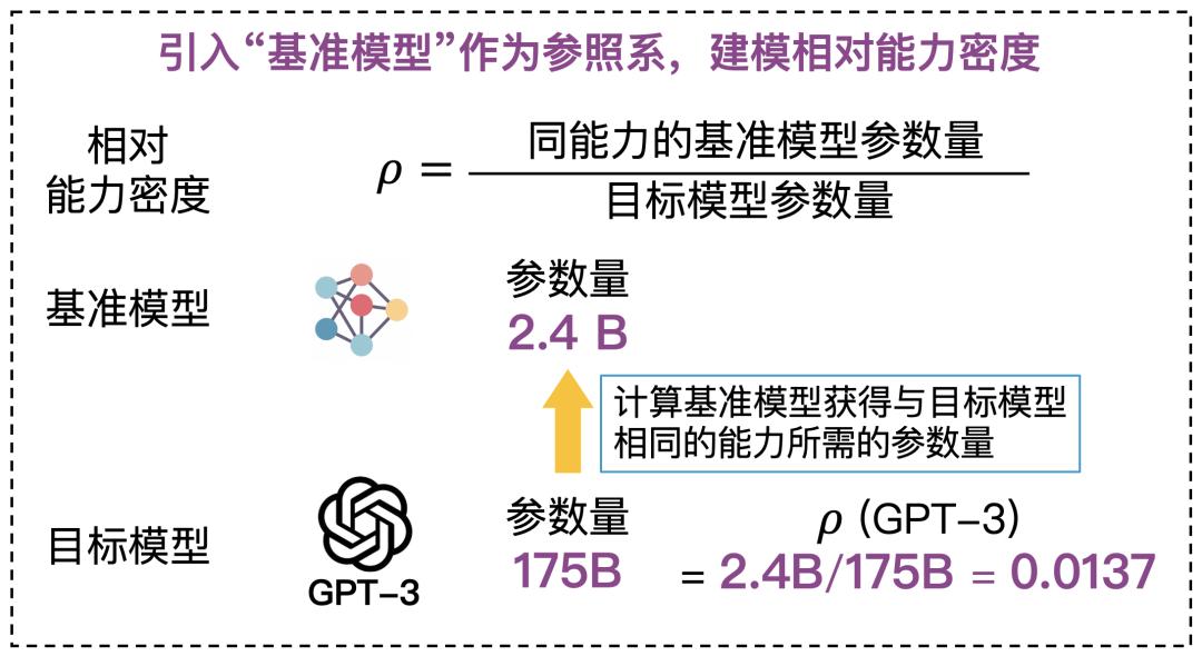 我们假设用同一套技术方案训练的模型,无论尺寸大小,其密度大致相同。我们将这套方案训练出的模型作为 Reference Model,并假设其密度为 1。然后,我们观察目标模型达到某种智能水平时,Reference Model 需要多大参数才能达到相同水平。通过比较两者达到相同能力所需的参数量,我们就可以算出目标模型的相对密度。这种方法规避了直接计算模型内部智能总量的难题。
