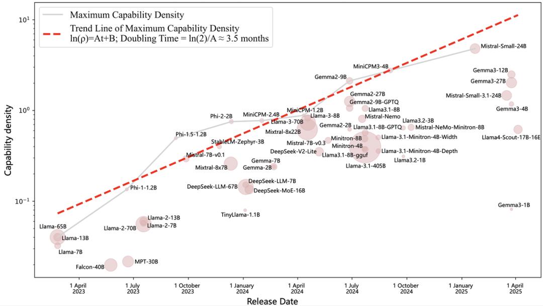 基于对51个主流大模型的严谨回测,论文揭示了惊人的非线性进化规律:从2023年到2025年,大模型的智能密度以每3.5个月翻倍的速度狂飙。