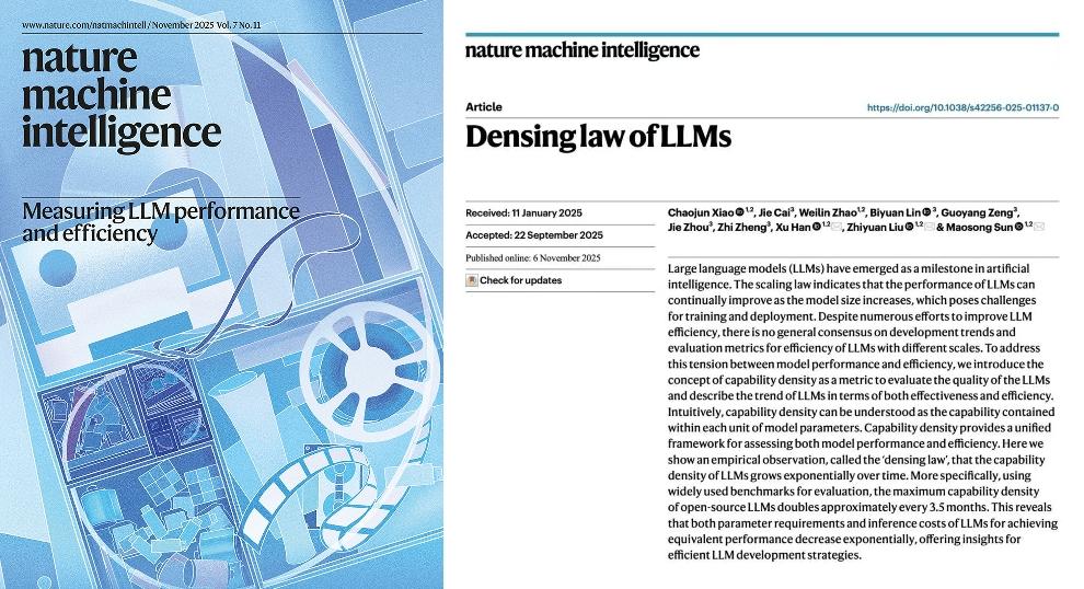 2025年11月,刘知远团队的研究登上全球顶级学术期刊《自然·机器智能》(Nature Machine Intelligence)封面,正式提出大模型的“密度法则”(Densing Law)。