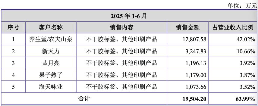 2022-2025年上半年,江天科技对第一大客户养生堂/农夫山泉的销售金额分别为1.13亿元、2.05亿元、1.9亿元和1.28亿元,占营业收入比例分别为29.40%、40.29%、35.33%和42.02%,占比较高,且存在一定波动。甚至于,2023年,仅东方树叶品牌的爆卖,就能给江天科技带来超8000万的业绩增量。
