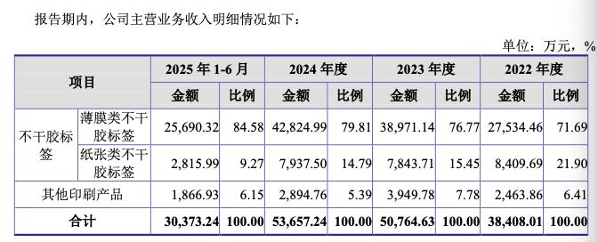 数据显示,2022年薄膜类标签占营收的比例为71.69%,2024年提升到79.81%。2025年上半年,薄膜类标签营收占比更是高达84.58%,同期营收2.57亿元;而纸张类标签同期营收仅2816万元,占比9.27%。