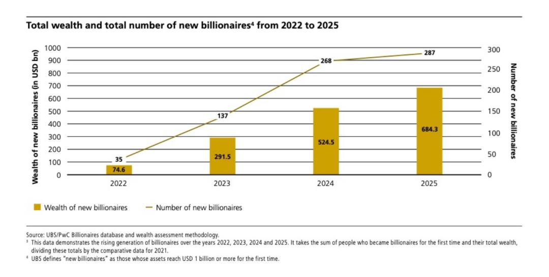 图:2022年至2025年全球新晋亿万富豪人数及其总财富