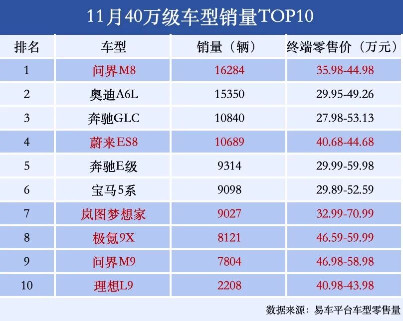 与此同时,国产品牌在40万级T0P 10榜单上席位显著增加。2024年仅有问界M9和理想L9两款车上榜。而今年11月,这个榜单已经出现了蔚来ES8、极氪9X、岚图梦想家、问界M8以及问界M9、理想L9六款国产车型。