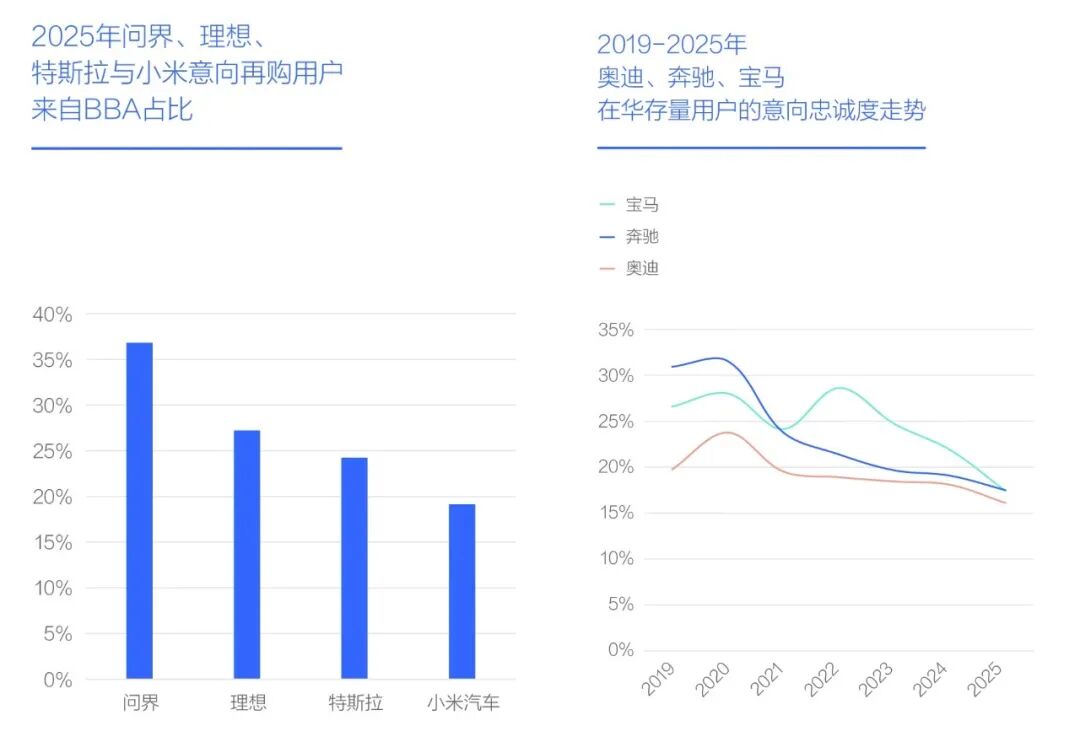 表面上,这只是餐饮标准变化引发的直接市场反馈,但往深了看,这顿饭背后,是传统豪华车的市场份额正在被国产豪车加速蚕食。调研数据显示,今年问界、理想的意向用户中,分别有36.81%、27.22%来自BBA用户的增换购需求。