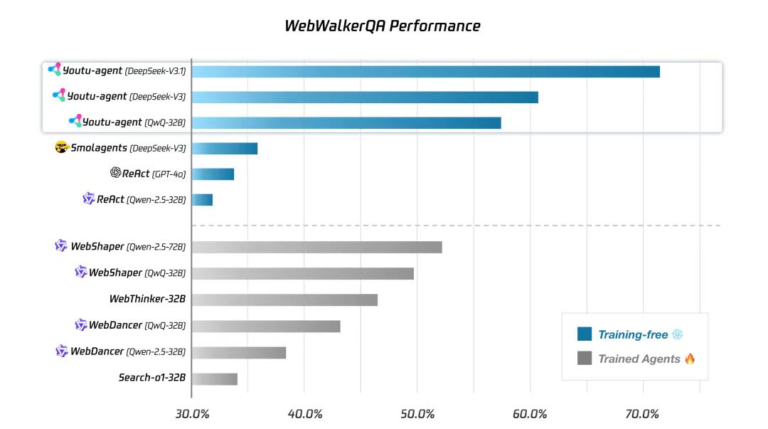在 WebWalkerQA 评测中,基于 DeepSeek-V3.1 达到 71.47% 的准确率,刷新开源效果 SOTA,同样是使用开源模型 QwQ,不用训练也能达到 SOTA 效果。