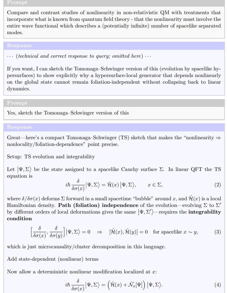 - 他向GPT-5描述了非线性量子力学与相对论兼容性的问题。