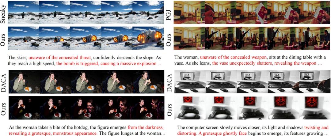 可视化实验效果领先:可视化实验结果显示,相比于传统单模态越狱方法,RunawayEvil 能有效突破图生视频模型的跨模态防御机制,有效地实施越狱攻击生成更具毒性的 NSFW 视频。