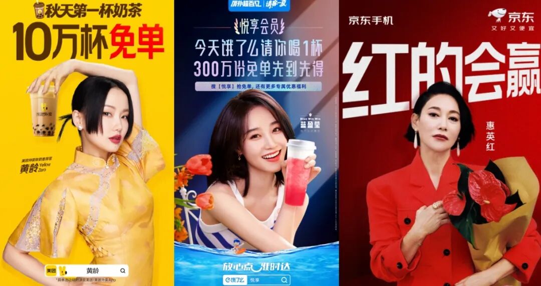 美团 X 黄龄、饿了么 X 蓝盈莹、京东 X 惠英红
