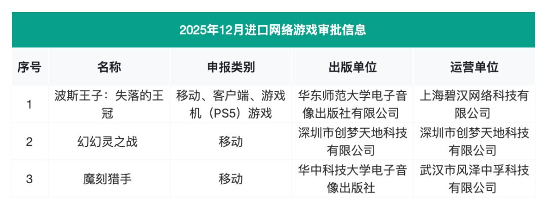 而在新一批进口版号当中,上海碧汉《波斯王子:失落的王冠》、创梦天地《幻幻灵之战》、武汉风泽中孚《魔刻猎手》三款产品也成功通过了审批。