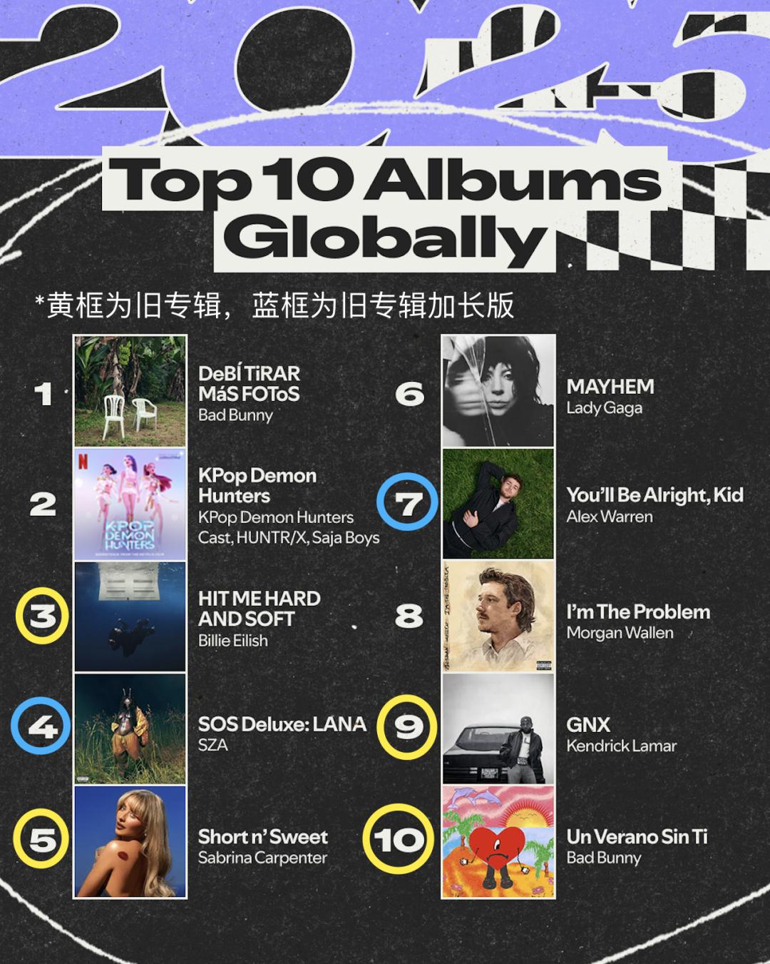 但平台的年度盘点仍然让人倒吸一口凉气,Spotify的2025年度十大专辑盘点中,碧梨Billie Eilish的《HIT ME HARD AND SOFT》排第3,匠妹Sabrina Carpenter的《Short n’ Sweet》排第5,十张专辑有四张非当年发行,还有两张是旧专辑的加长版,哪怕是人气急升的匠妹,新专辑的热度也没能干过她去年的旧专辑。
