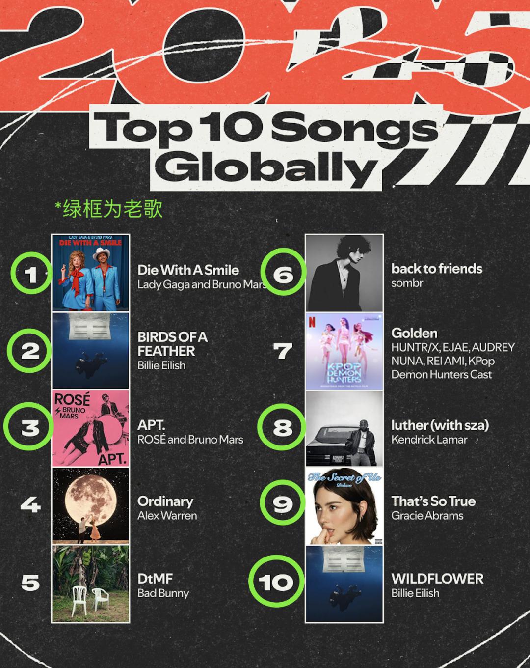 尽管2025年也有一些高流量的新歌出现,比如Alex Warren的《Ordinary》和《K-Pop:猎魔女团》的《Golden》问世,但传播热度明显不如去年的《Die With A Smile》(Lady Gaga和Bruno Mars)、《APT.》和《BIRDS OF A FEATHER》(Billie Eilish)。