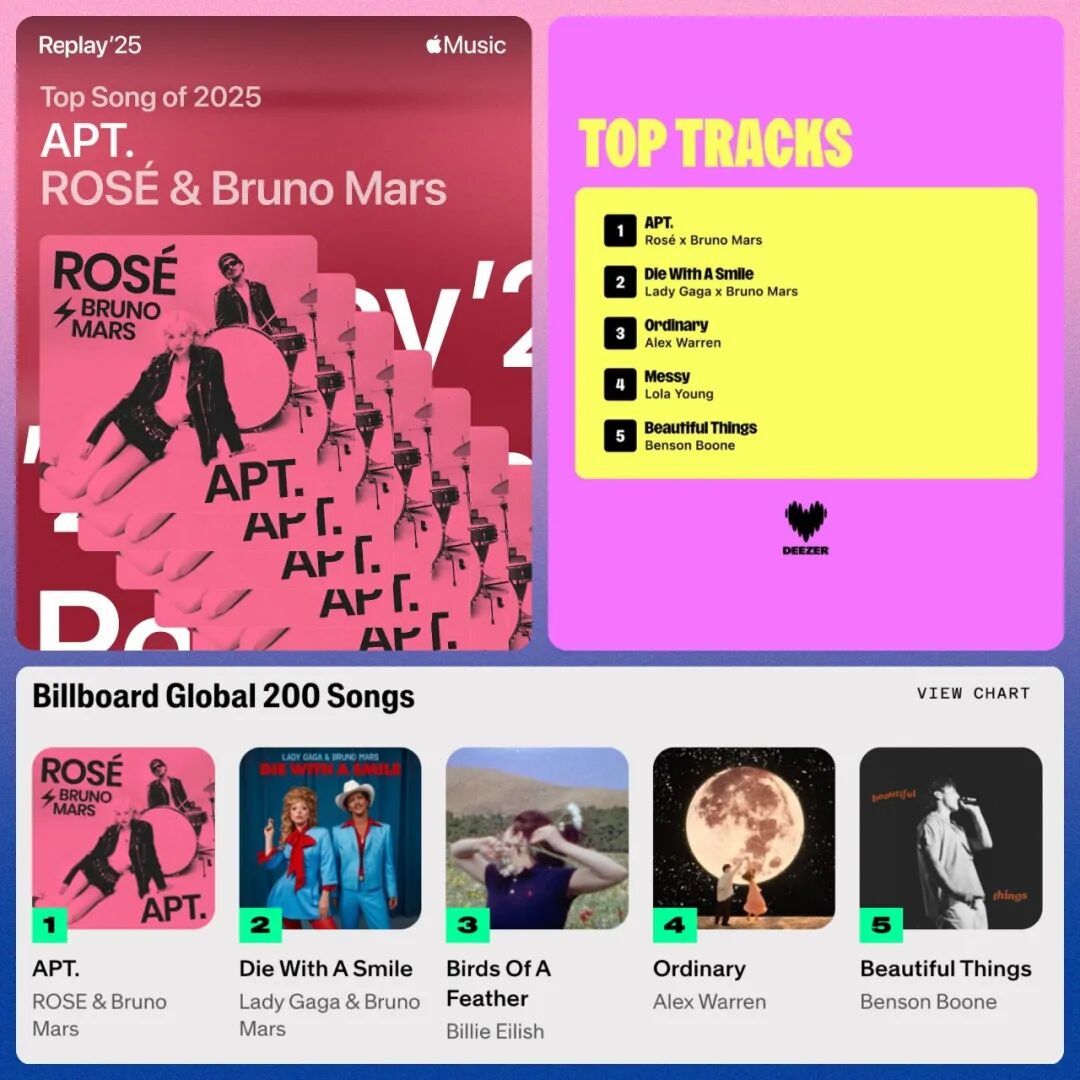 在Spotify的2025年度最火歌曲盘点里,《APT.》排名第3,在TikTok的年度最火歌曲排名第6,在Apple Music、Deezer和Billboard的全球200热门单曲年榜上,《APT.》都是2025最火歌曲。