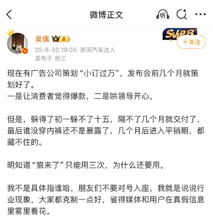 知名汽车博主吴佩发文揭露“小订”订单数量造假,图片来源:吴佩微博