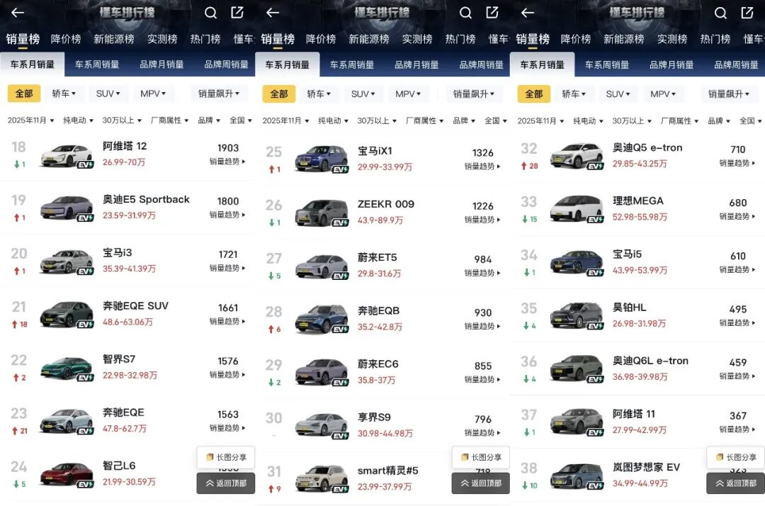 根据懂车帝显示的2025年11月销量数据,30万元以上的高端纯电车型中月销量低于2000辆的车型,不乏知名厂商生产的知名车型。