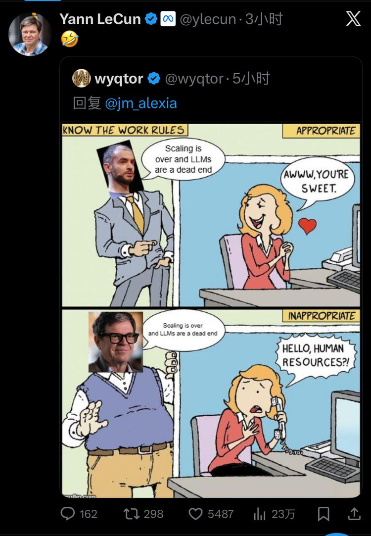 他们一个是LLM的异 教徒,一个是LLM的改良者,但在2025年终于在同一个问题上走到了同一个立场。所以Yann Lecun后来在X上转发了一张漫画,也算是对类似论调的一种认同。