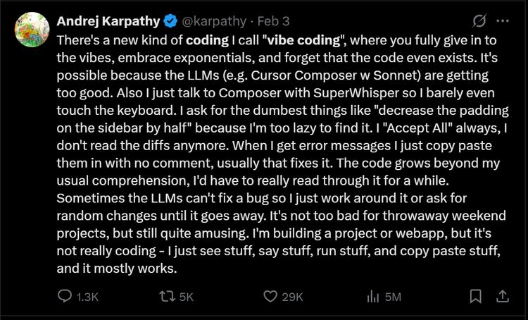 年初,硅谷人民精神导师Andrej Karpahy 的这条推特引发了持续至今的AGI造词运动。起初人们以为他说的只是Coding,但很快Vibe便占领了AGI的每一个角落。从Vibe Coding到Vibe Design、Vibe Marketing,最后变成了Vibe Everything……